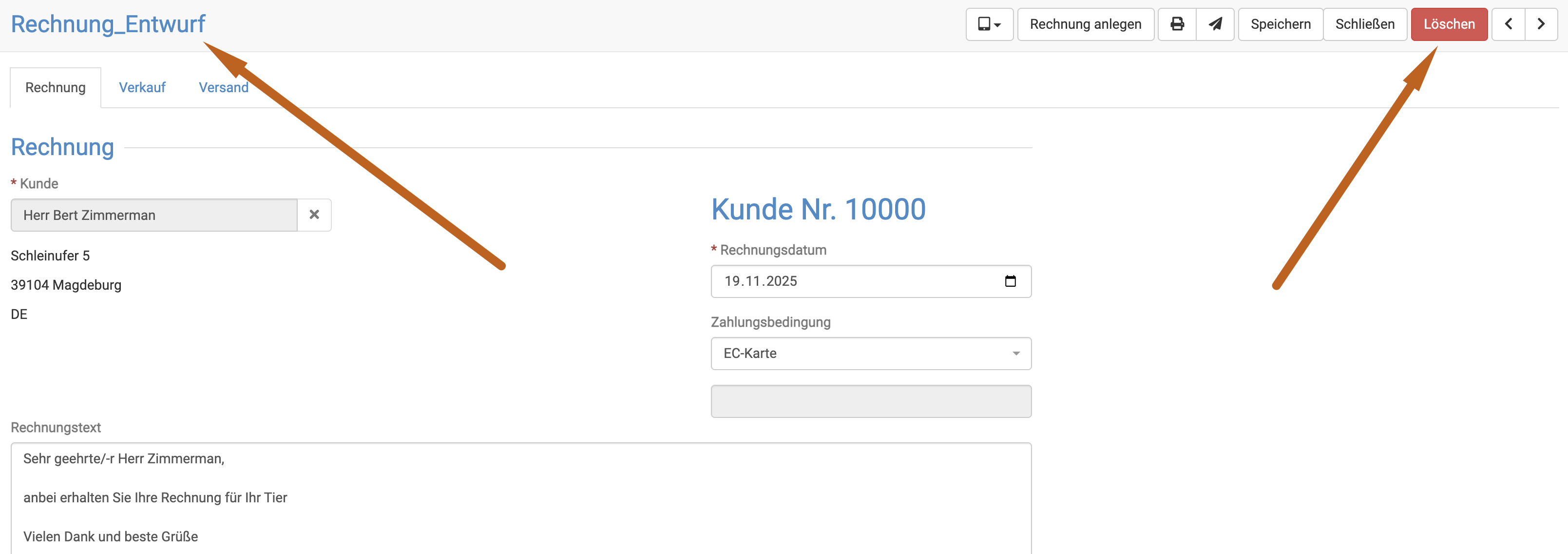 Dort tragen Sie in den Rechnungsschlusstext ein, welche Summe noch offen ist, bzw. welche gezahlt wurde.