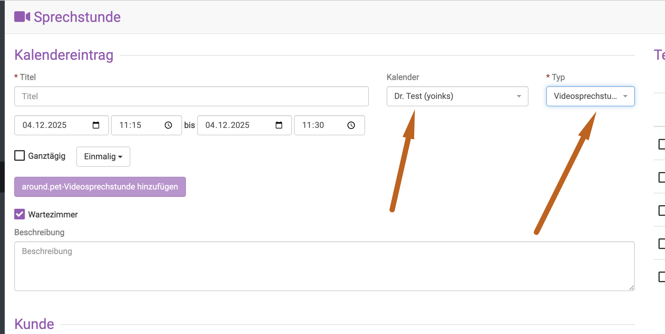 Geben Sie den Grund des Termins ein und wählen Sie als Kalender den Kalender des gewünschten Therapeuten. Wählen Sie außerdem bei "Typ" den Typ "Videosprechstunde"