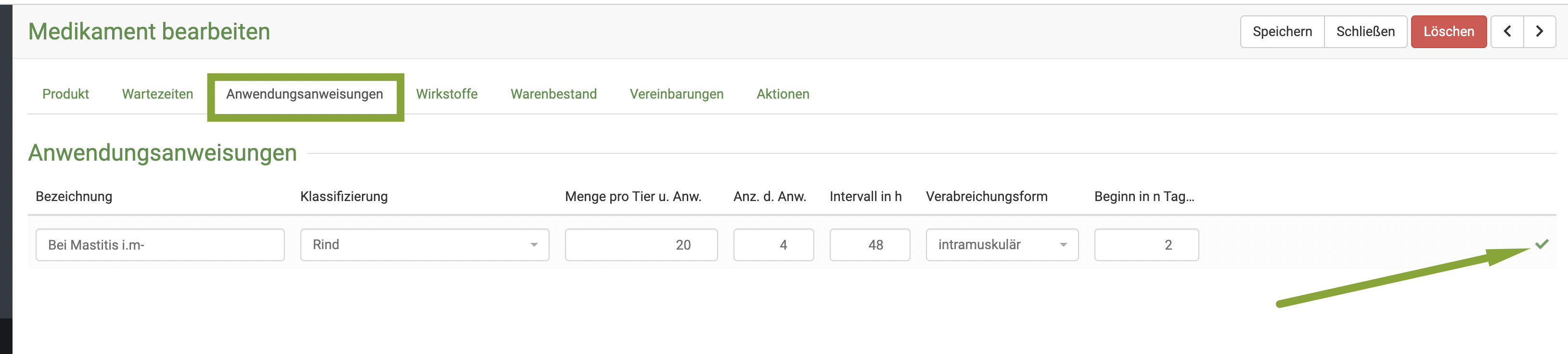 Klicken Sie am Produkt den Reiter Wartezeiten, um diese dann individuell nach Tierart setzen oder ändern zu können. Denken Sie daran, nach der Eingabe erst den grünen Haken zu klicken und anschließend oben rechts auf Speichern zu klicken.