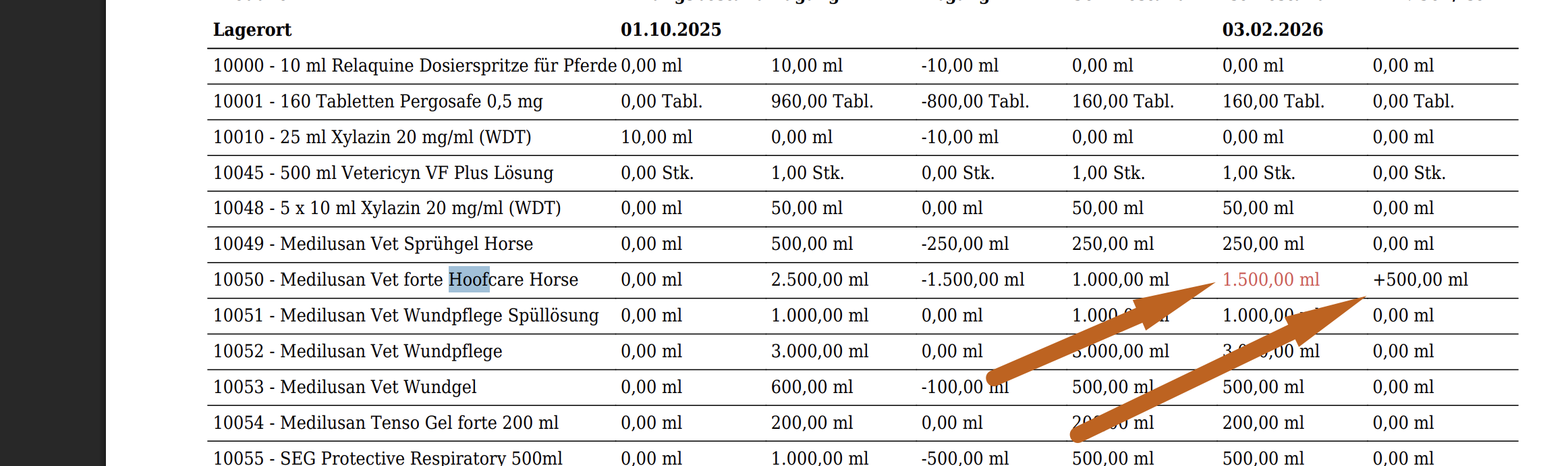 Nun sehen Sie eine Auflistung der Zu- und Abgänge. Im Falle einer Apothekenprüfung empfehlen wir Ihnen folgendes: