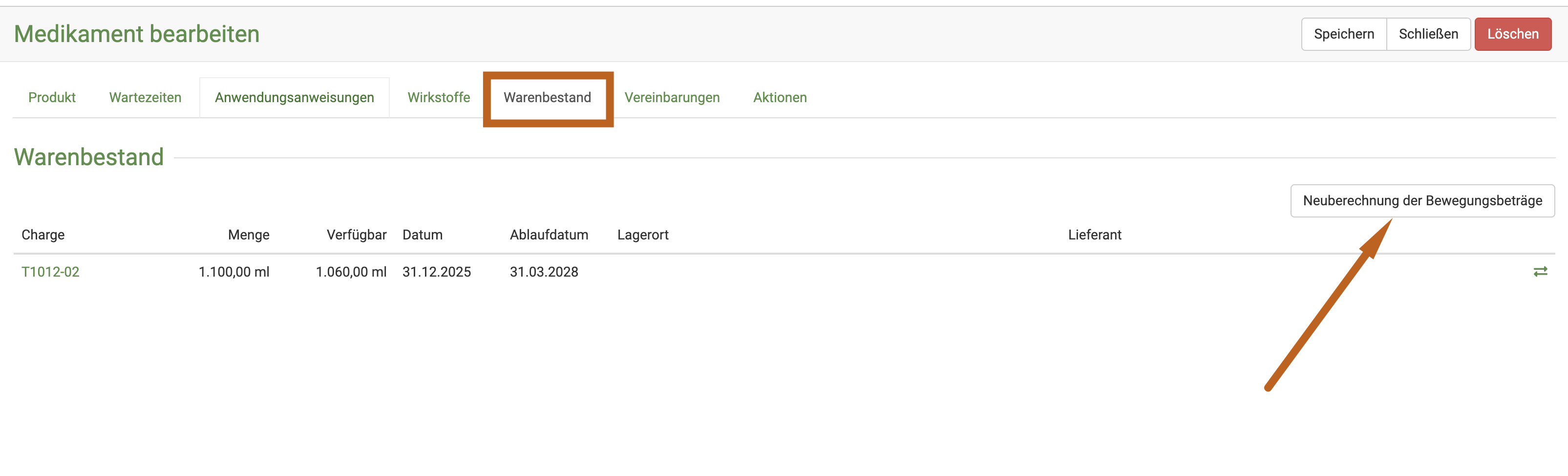 Wenn Ihnen ein Fläschchen herunterfällt oder etwas kaputt geht, können Sie dieses über die Korrektur ebenso eintragen. Klicken Sie hierzu auf Warenwirtschaft und dann Warenbestände und öffnen Sie dann das zu korrigierende Medikament.